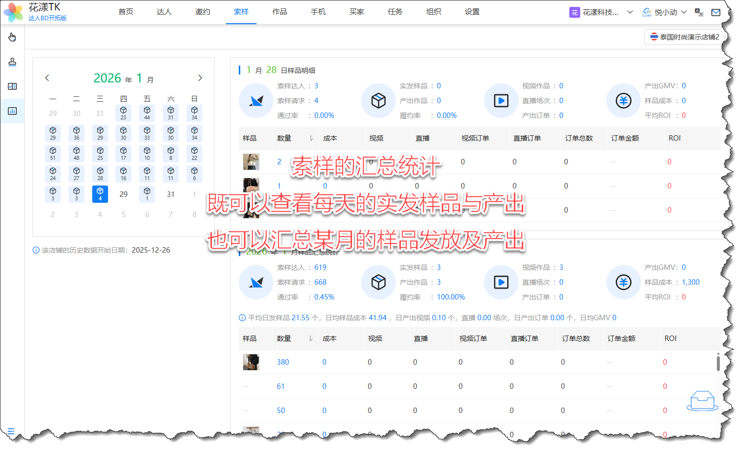 针对上述需求,本版本推出了索样请求的汇总统计,让卖家朋友既可以查看每天实发样品的详情,也能够汇总每月样品实际发放与产出的统计报表:
