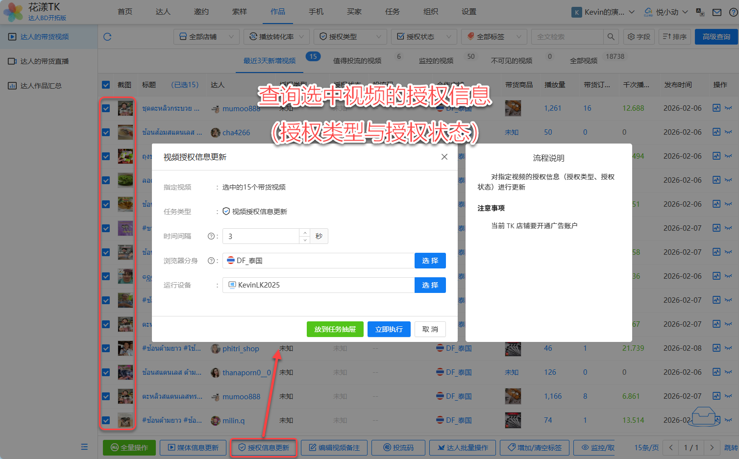 新版本增加了一个新的流程:视频授权信息更新,可以对用户选中的视频查询其授权信息(含授权类型与授权状态),这样更能够方便用户一目了然的知道哪些视频处于已授权状态,哪些视频的授权状态尚未取得(如授权码已过期):