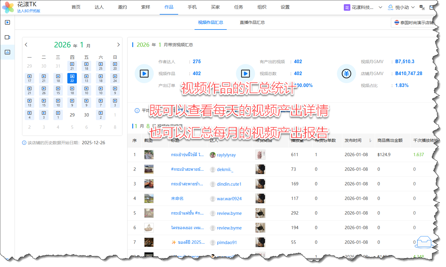 针对视频与直播作品,新版本也提供了汇总统计与分析,让卖家朋友可以查看每天视频与直播作品的产出详情,也能够汇总每月视频与直播的产出报告: