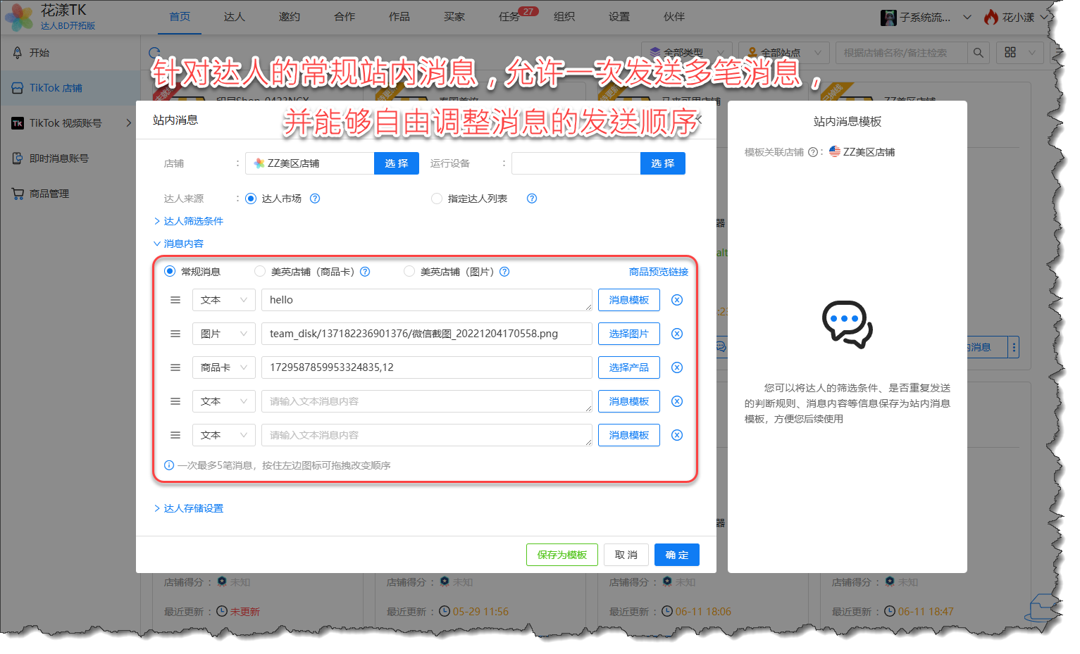 3. 达人站内消息允许自行调整消息内容的发送顺序