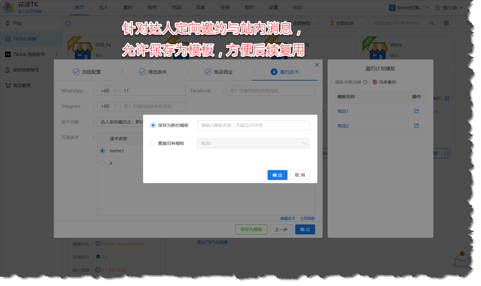 新版本针对达人定向邀约与站内消息支持“模板”操作,换言之,您可以将某个定向邀约计划或者某个达人站内消息保存为模板,方便您下次复用: