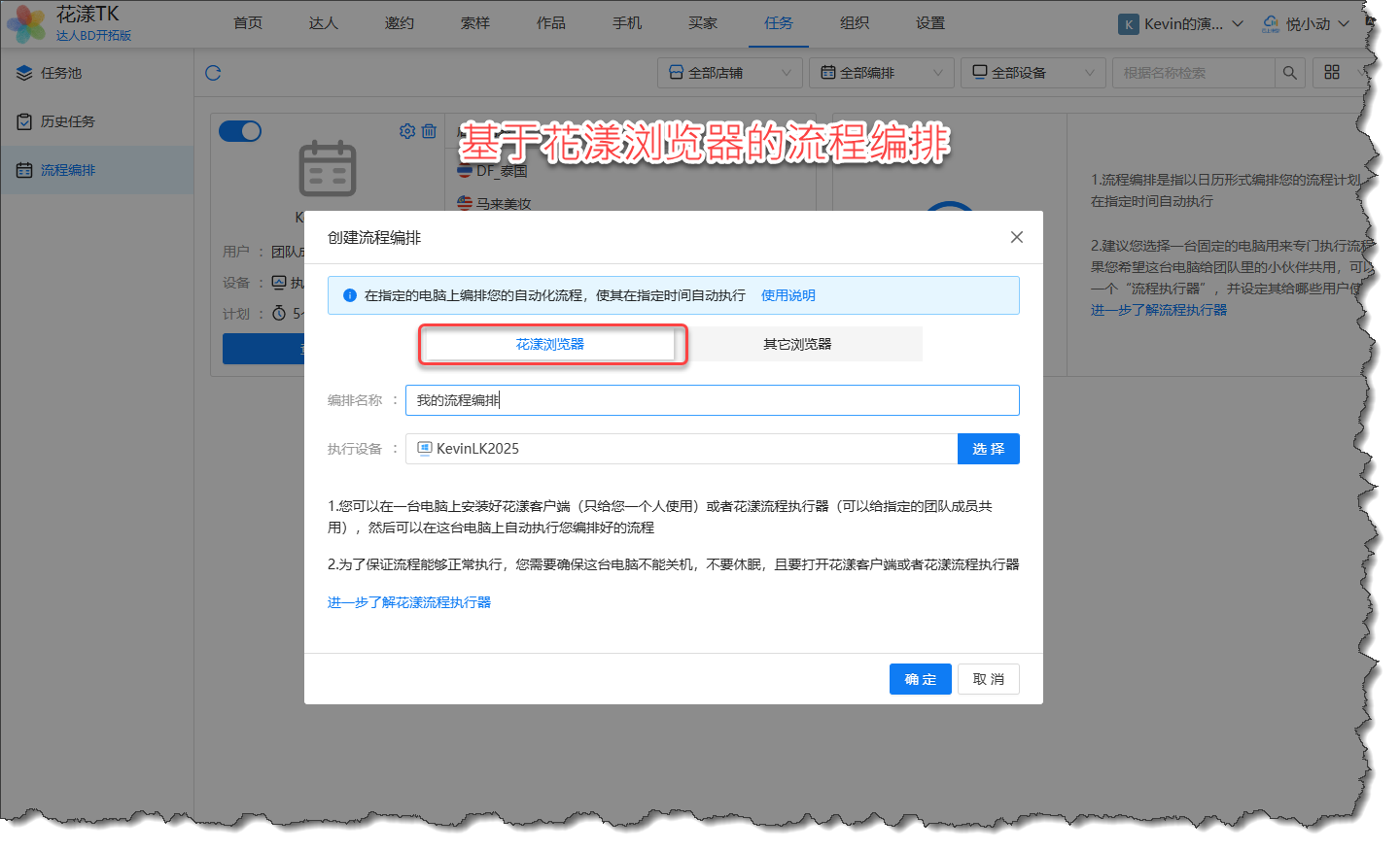 当创建“基于花漾浏览器的流程编排”时,需要选择一台设备,这台设备可以是安装了花漾客户端,也可以是花漾流程执行器,如下图所示:
