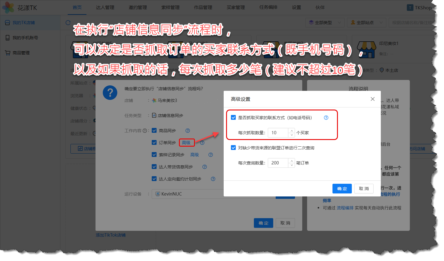 - 每天晚上执行一次店铺信息同步流程,设置为只抓取10笔订单的买家手机号码