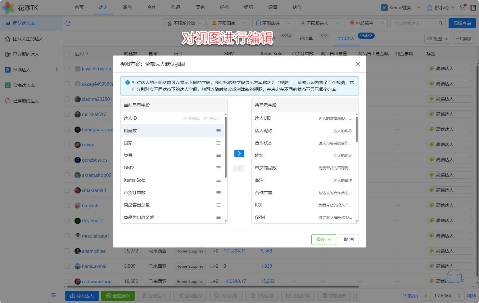 针对达人的字段展示,系统做的更加复杂一些。因为达人的属性实在太多了,特别是针对不同合作状态下的达人,用户希望看到的字段是不一样的。举例,针对“已触达”的达人,用户希望看到达人的“履约率”,但针对“已出单”的达人,用户希望看到达人的“带货订单数”。针对这类场景,花漾TK提出了“视图”的概念。所谓视图,就是不同字段的显示方案可以保存为一个视图,在不同的状态下,达人可以显示不同的视图方案。