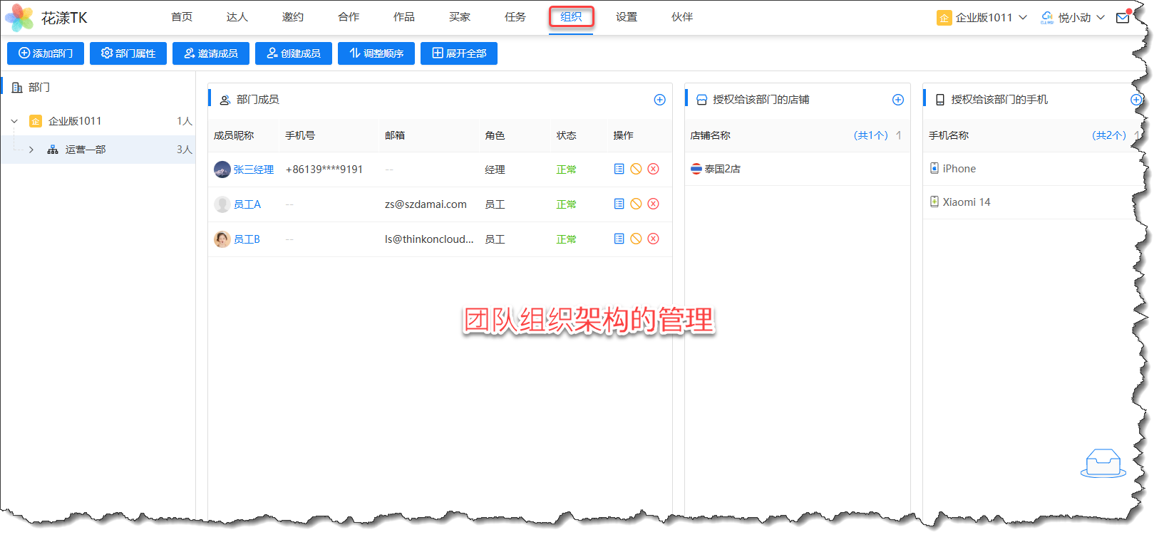 您可以在花漾TK门户中完成对当前团队组织架构的管理,如下图所示: