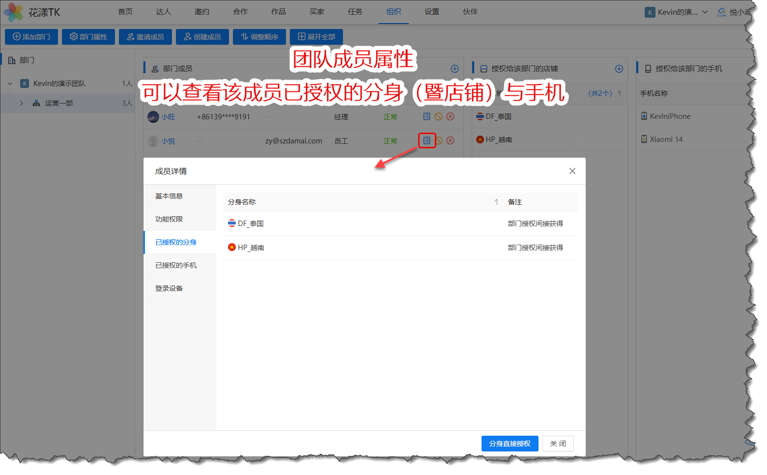 在团队成员的属性对话框,可以查看该团队成员授权过的店铺与手机: