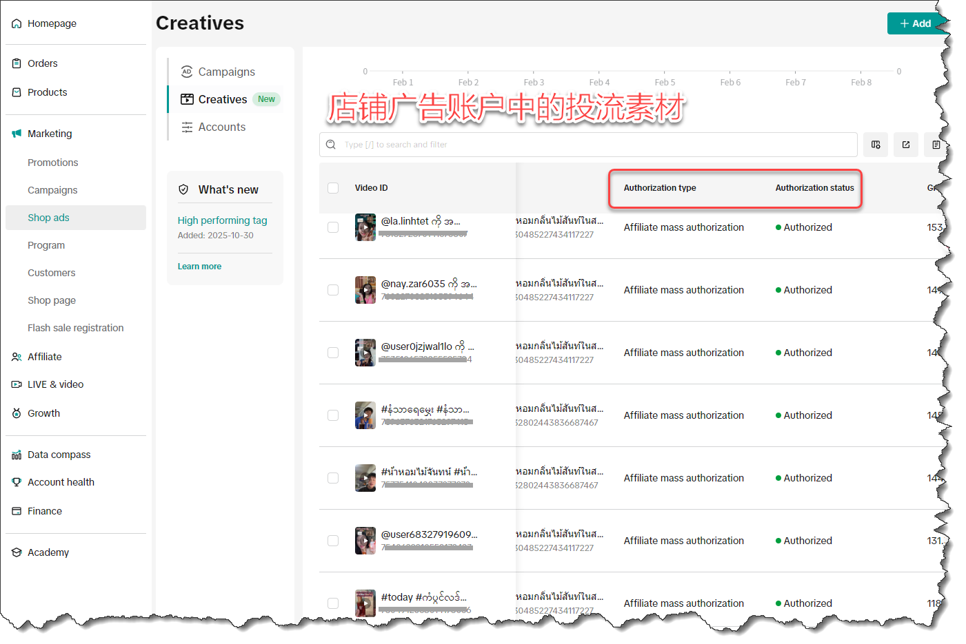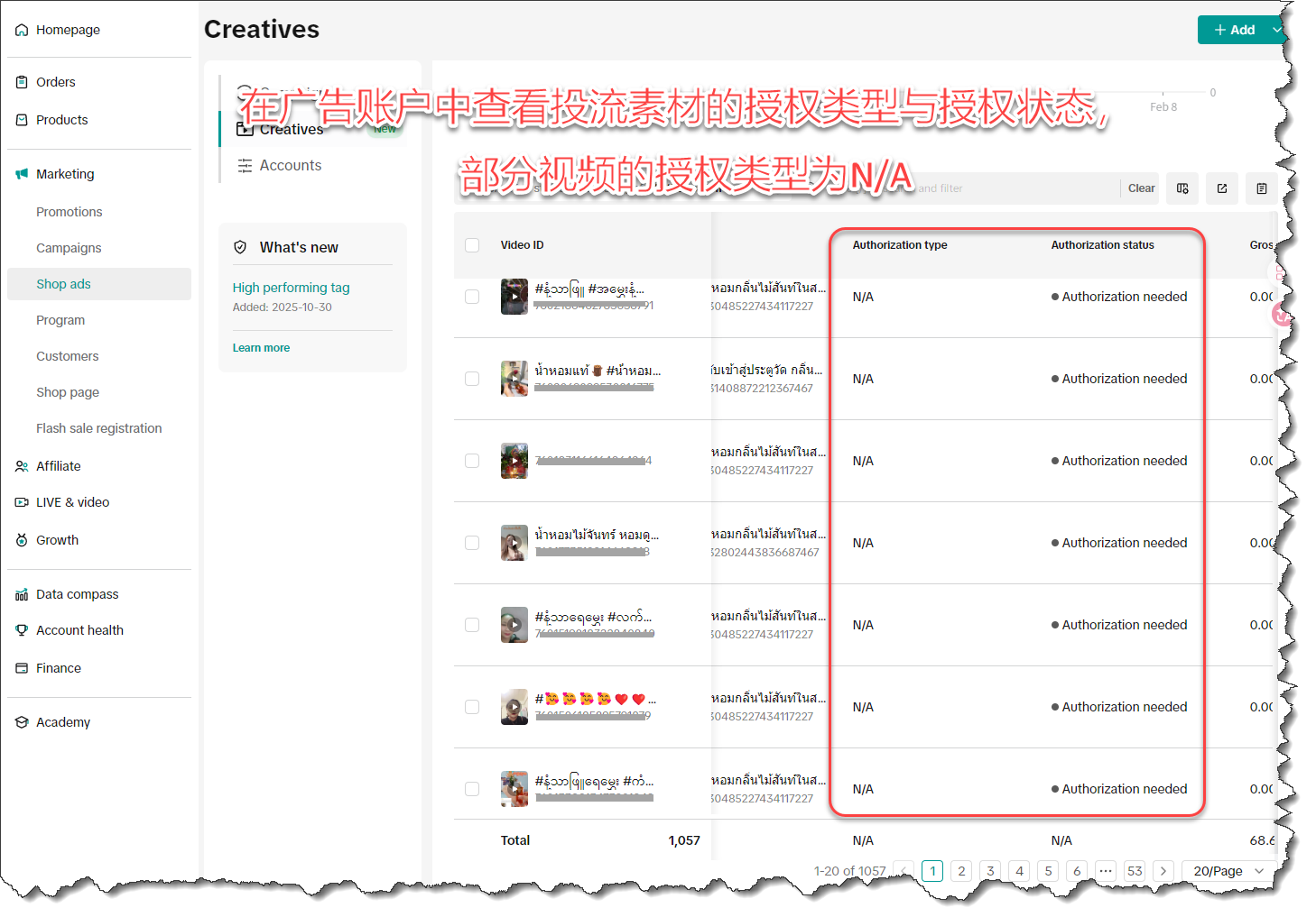 视频的 “授权类型” 与 “授权状态”,对应着店铺广告账户中投流素材的相应字段 “Authorization type” 与 “Authorization status”,如下图所示: