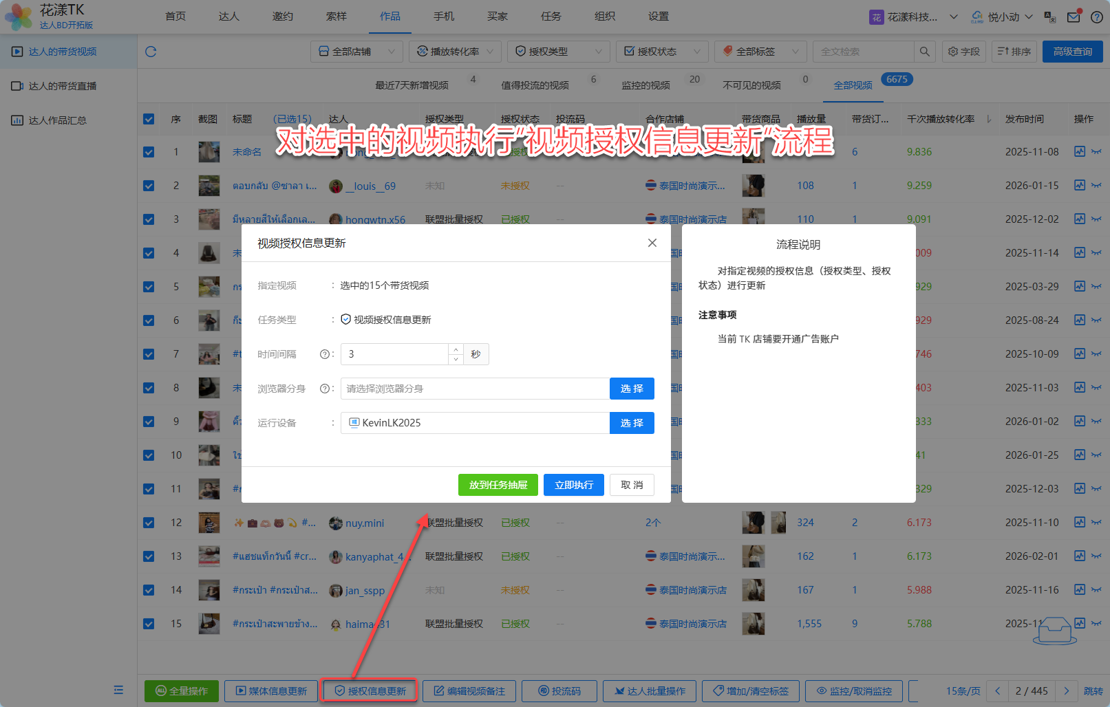 《对选中的视频执行“授权信息更新”流程》